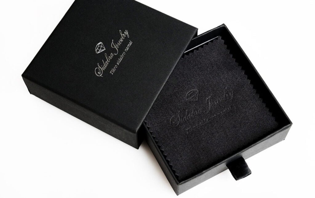 Visi papuošalai pakuojami į vardines “Sidabra Jewelry” stalčiuko tipo dėžutes, kurios papuoštos sidabriniu mūsų prekės ženklo logotipu. Dėžutėje rasite, ne tik išsirinktą papuošalą, bet ir informacinį lankstinuką su padėka ir dėvėjimo rekomendacijomis, sidabro priežiūros ir poliravimo šluostę, kuri impregnuota sidabrui valyti skirtomis medžiagomis, todėl papuošalus išlaikysite blizgius ir spindinčius. Graži papuošalų dėžutė ir puošnus supakavimas palengvins užduotį ieškantiems dovanos – galite iš karto dovanoti ir maloniai nustebinti artimą žmogų. Siekiame, kad kiekviena akimirka, nuo siuntos atsiėmimo, jos išpakavimo iki papuošalo paėmimo į rankas, taptų malonia patirtimi Jums.