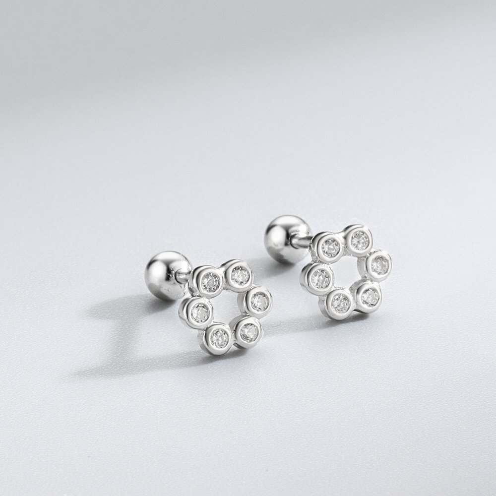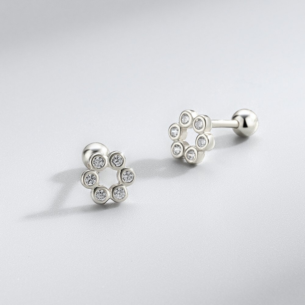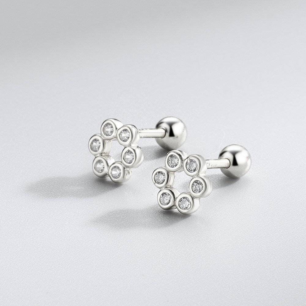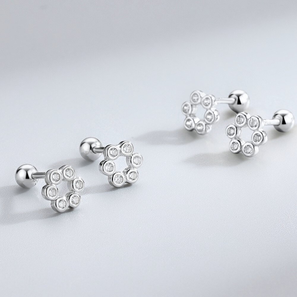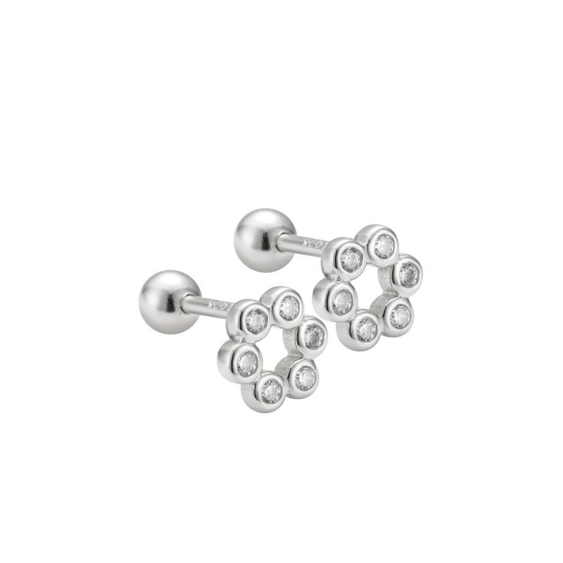 Sidabriniai helix auskarai Flora tai subtilūs ir elegantiški papuošalai, sukurti gėlės formos dizainu iš smulkių žėrinčių cirkonio kristalų. Jų minimalistinė forma spindi šviesa ir suteikia įvaizdžiui moteriško žavesio. Helix auskarai Flora pagaminti iš tikro 925 prabos sidabro, kuris yra patvarus, tvarus ir visuomet vertingas pasirinkimas. Patogus užsukamas užsegimas leidžia juos segėti tiek ausies pagalvėlėje, tiek kremzlėje, todėl šis aksesuaras yra universalus stiliaus palydovas. Sidabriniai helix auskarai Flora sveria 0.7 gramo, gėlytės skersmuo yra 6mm, užsukamas burbuliukas 3mm skersmens, o strypelis – 6mm ilgio.