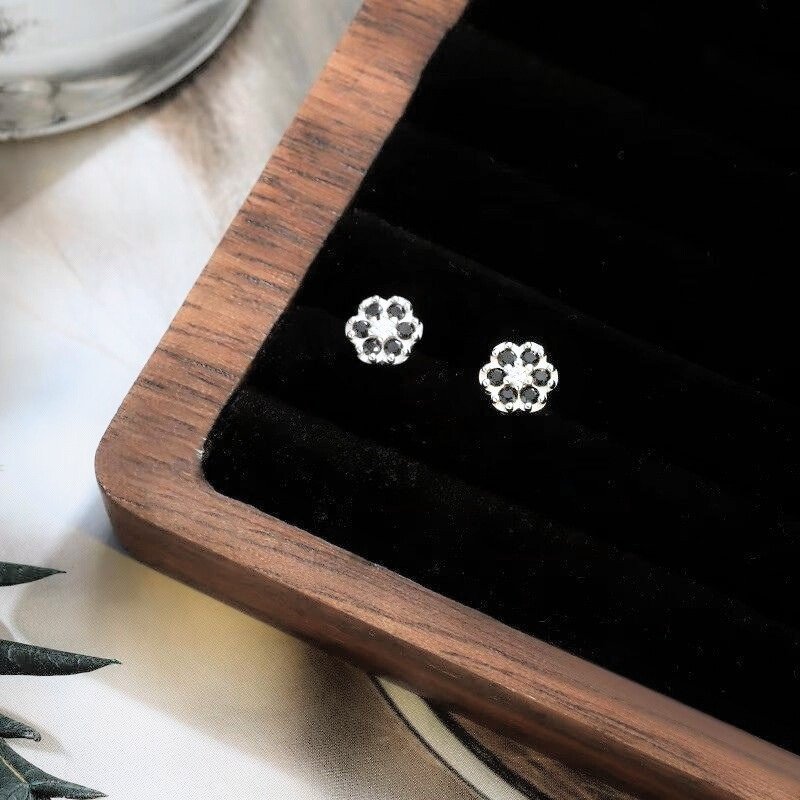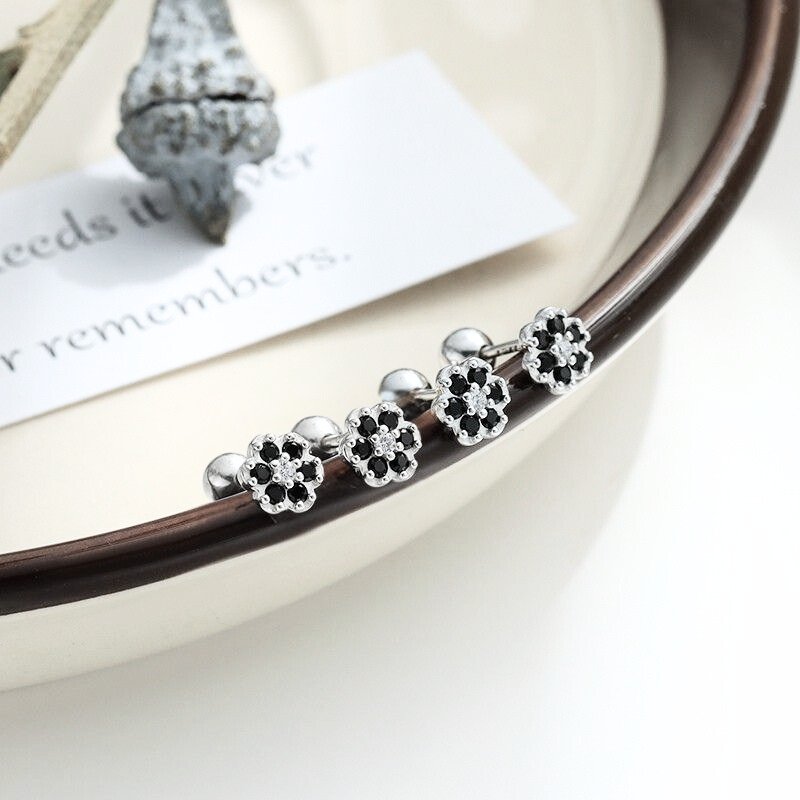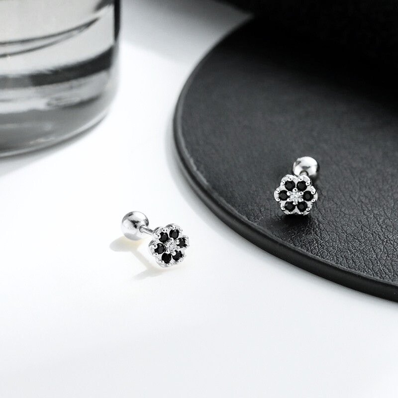 Sidabriniai helix auskarai Lotus tai elegantiški aksesuarai, sukurti gėlės formos dizainu su juodais kristalais ir šviesiu akmenuku centre. Šviesos ir tamsos kontrastas suteikia jiems ypatingo rafinuotumo bei išraiškingo charakterio. Helix auskarai Lotus pagaminti iš tikro 925 prabos sidabro, kuris yra tvarus, ilgaamžis ir visuomet vertingas pasirinkimas. Patogus užsukamas užsegimas leidžia juos segėti tiek ausies pagalvėlėje, tiek kremzlėje, todėl šis aksesuaras tampa universaliu pasirinkimu įvairioms progoms. Sidabriniai helix auskarai Lotus sveria 1.3 gramo, gėlytės skersmuo yra 6mm, užsukamas burbuliukas 4mm skersmens, o strypelis – 6mm ilgio.