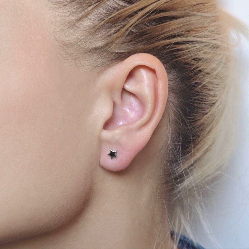 Sidabriniai helix auskarai Night tai nakties dangaus kūnų įkvėpti aksesuarai, dekoruoti juodos emalės žvaigždėmis. Sidabro spindesio ir juodos spalvos kontrastas suteikia auskarams šiuolaikiško charakterio bei subtilaus žavesio. Helix auskarai Night pagaminti iš tikro 925 prabos sidabro, kuris yra ilgaamžis, tvarus ir visuomet vertingas pasirinkimas. Patogus užsukamas užsegimas leidžia juos segėti tiek ausies pagalvėlėje, tiek kremzlėje, todėl jie tampa universaliu stiliaus akcentu įvairioms progoms. Sidabriniai helix auskarai Night sveria 1.1 gramo, žvaigždutės skersmuo 6mm, užsukamas burbuliukas 4mm skersmens, o strypelis – 6mm ilgio.