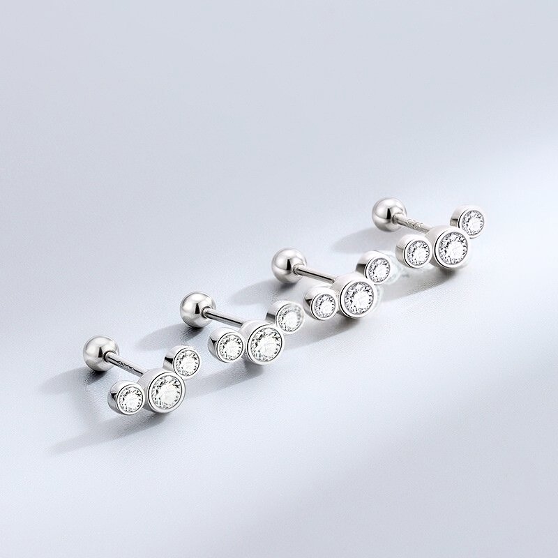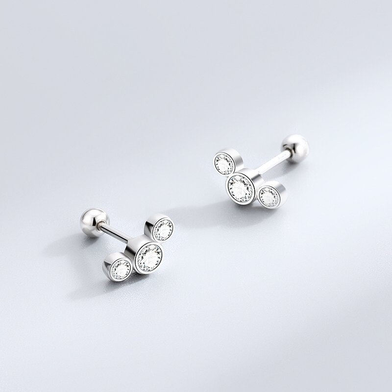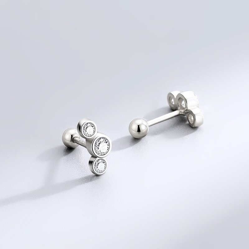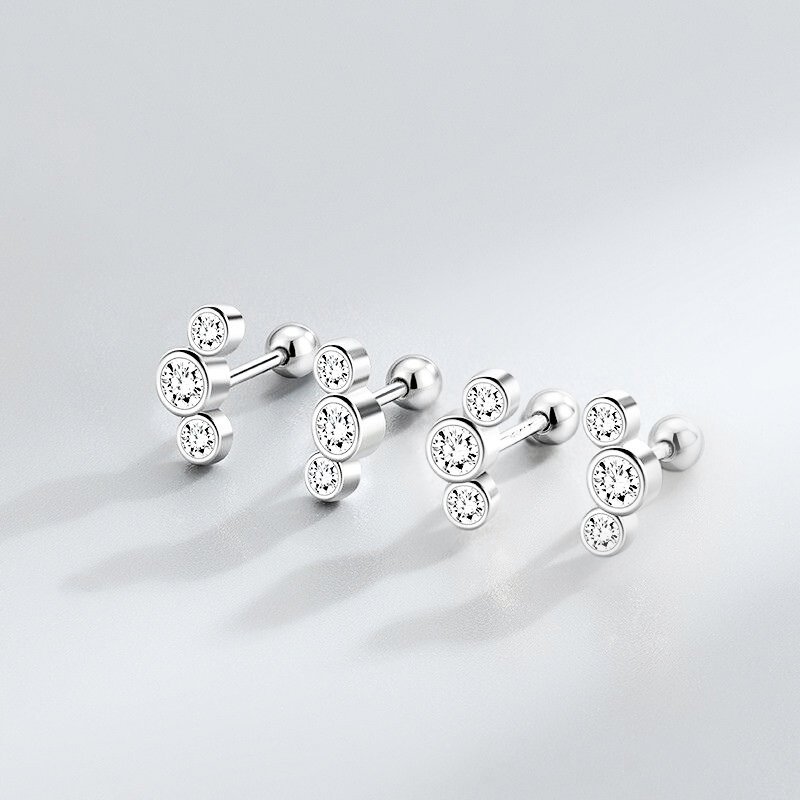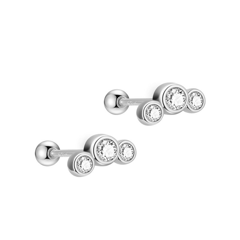 Sidabriniai helix auskarai Trio tai modernūs, universalaus dizaino papuošalai, papuošti trimis skaidriais cirkonio kristalais. Apvalūs sidabro rėmeliai išryškina akmenų spindesį ir suteikia auskarams tvarkingą, minimalistinę estetiką. Helix auskarai Trio pagaminti iš tikro 925 prabos sidabro, kuris yra tvarus, ilgaamžis ir visuomet vertingas pasirinkimas. Patogus užsukamas užsegimas leidžia juos segėti tiek ausies pagalvėlėje, tiek kremzlėje, todėl jie tinka tiek kasdieniam įvaizdžiui, tiek vakariniam stiliui. Sidabriniai helix auskarai Trio sveria 1.0 gramą, kristalų dalies ilgis sieka 8mm, plotis 4mm, užsukamas burbuliukas 3mm skersmens, o strypelis – 6mm ilgio.