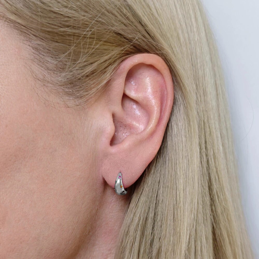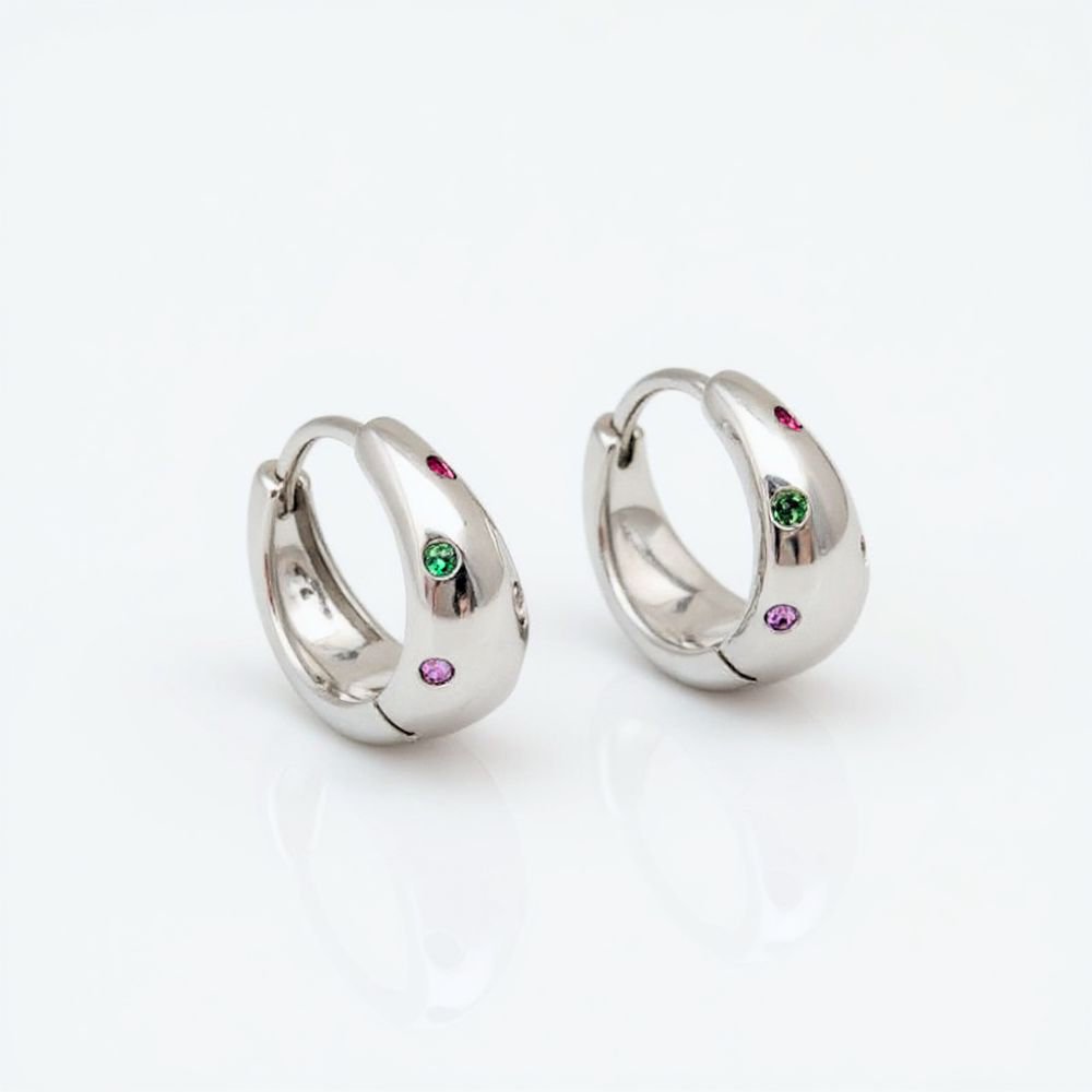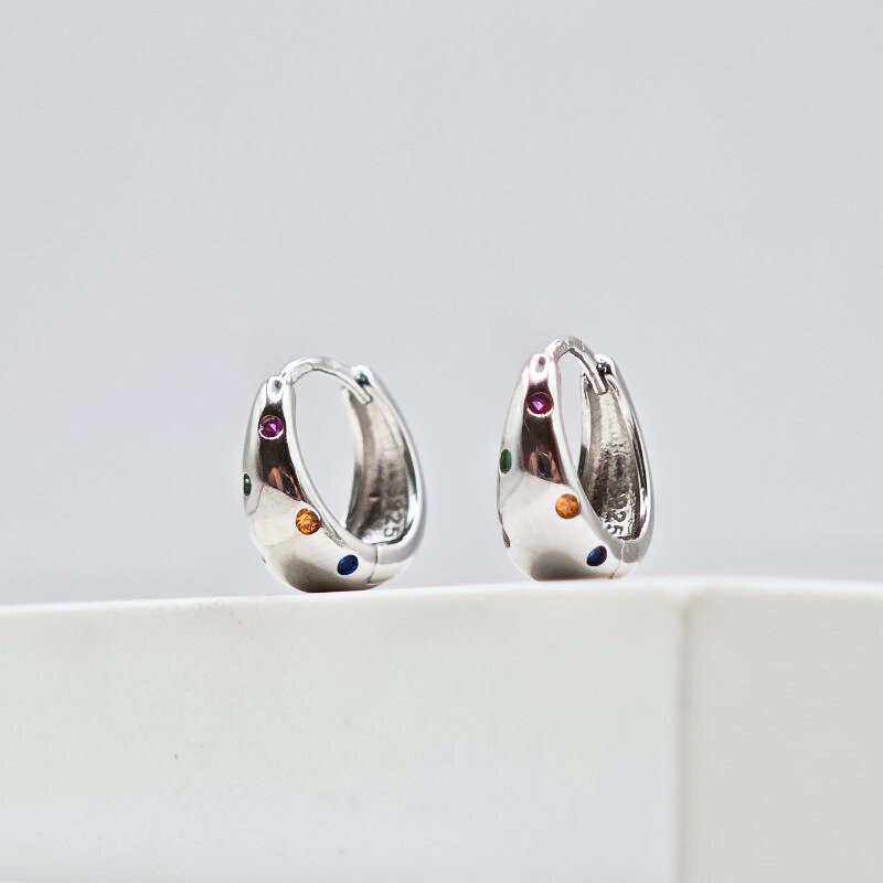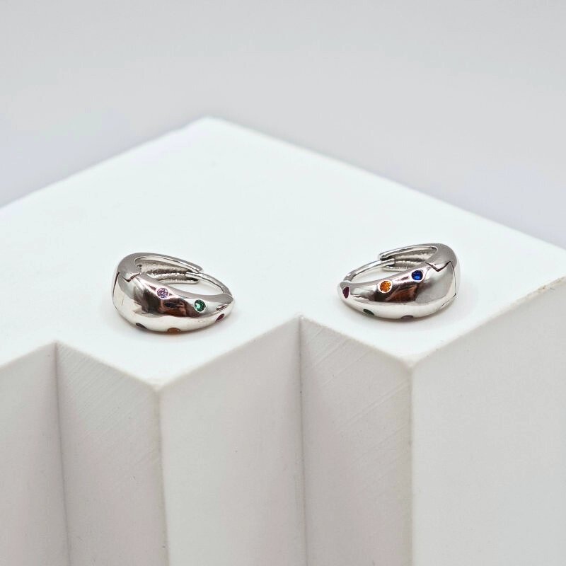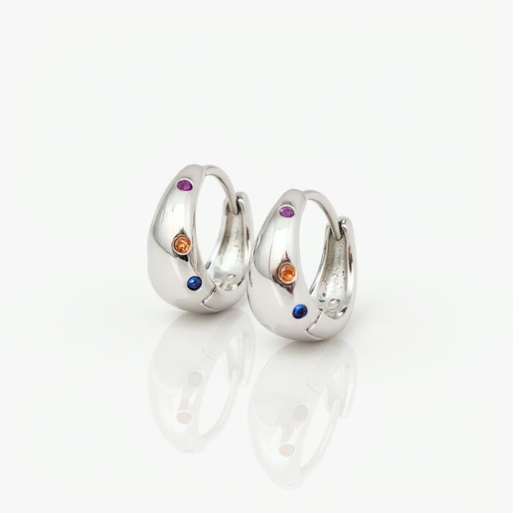 Sidabriniai auskarai Pop išsiskiria apvalia forma ir švariu, poliruoto sidabro paviršiumi. Spalvoti cirkonio kristalai suteikia žaismingumo bei gyvumo, tačiau tuo pačiu išlaiko ir tvarkingą moters įvaizdį. Auskarai Pop pagaminti iš tikro 925 prabos sidabro, kuris vertinamas dėl savo kokybės, ilgaamžiškumo bei tvarumo. Šis aksesuaras puikiai tinka moteriai, kuri mėgsta subtilius, bet išskirtinius papuošalus ir nori lengvo akcento kasdieniams bei laisvalaikio deriniams. Sidabriniai auskarai Pop yra platėjančios rinkutės, kurių skersmuo yra 12mm, o plačiausioje vietoje jos yra 5.5mm storio. Bendras jų svoris 2.6 gramo.