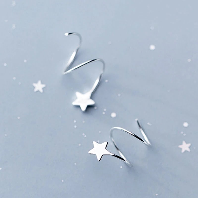Sidabriniai 925 prabos auskarai su žvaigždute įsiveria per ausies skylutė ir gražiai apsivynioja aplink apatinę ausies dalį. Puikiai tiks ir jaunesnėms merginoms ir suaugusioms moterims, kurios mėgsta smulkius minimalistinius papuošalus. Auskariukų matmenys 15mm x 10mm, o svoris 0.7 g.