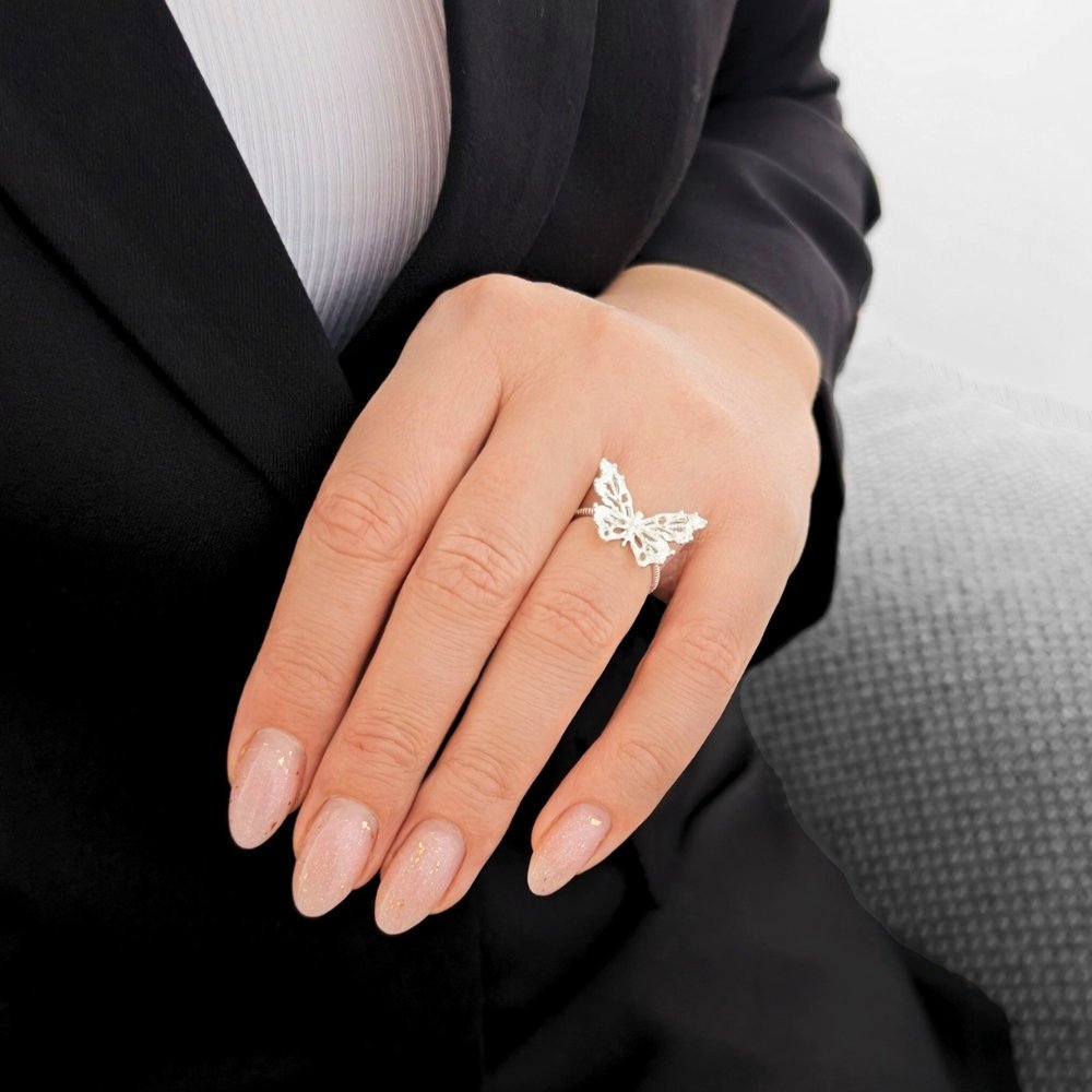 Sidabrinis žiedas Airyn išsiskiria subtiliu drugelio motyvu, kuris suteikia lengvumo ir moteriško žavesio. Ažūrinės detalės sukuria vizualiai lengvą išvaizdą, pabrėžia švarias dizaino linijas ir išryškina pagrindinį žiedo akcentą – didelį drugelį. Sidabrinis žiedas Airyn pagamintas iš tikro 925 prabos sidabro, vertinamo dėl ilgaamžiškumo, kokybės ir tvarumo. Šis papuošalas skirtas moteriai, kuri renkasi romantiškus akcentus ir nori švelnaus, lengvai derinamo stiliaus kasdienai ar ypatingoms progoms. Sidabrinis žiedas Airyn sveria 2.4 gramo, o dydis reguliuojasi pagal piršto apimtį, todėl puikiai tiks nešiojančioms net 16-20 dydžius. Esminis tokio žiedo privalumas, kad priklausomai nuo nuotaikos, aprangos ar įvaizdžio, galite rinktis ant kurio piršto jį norite dėvėti.