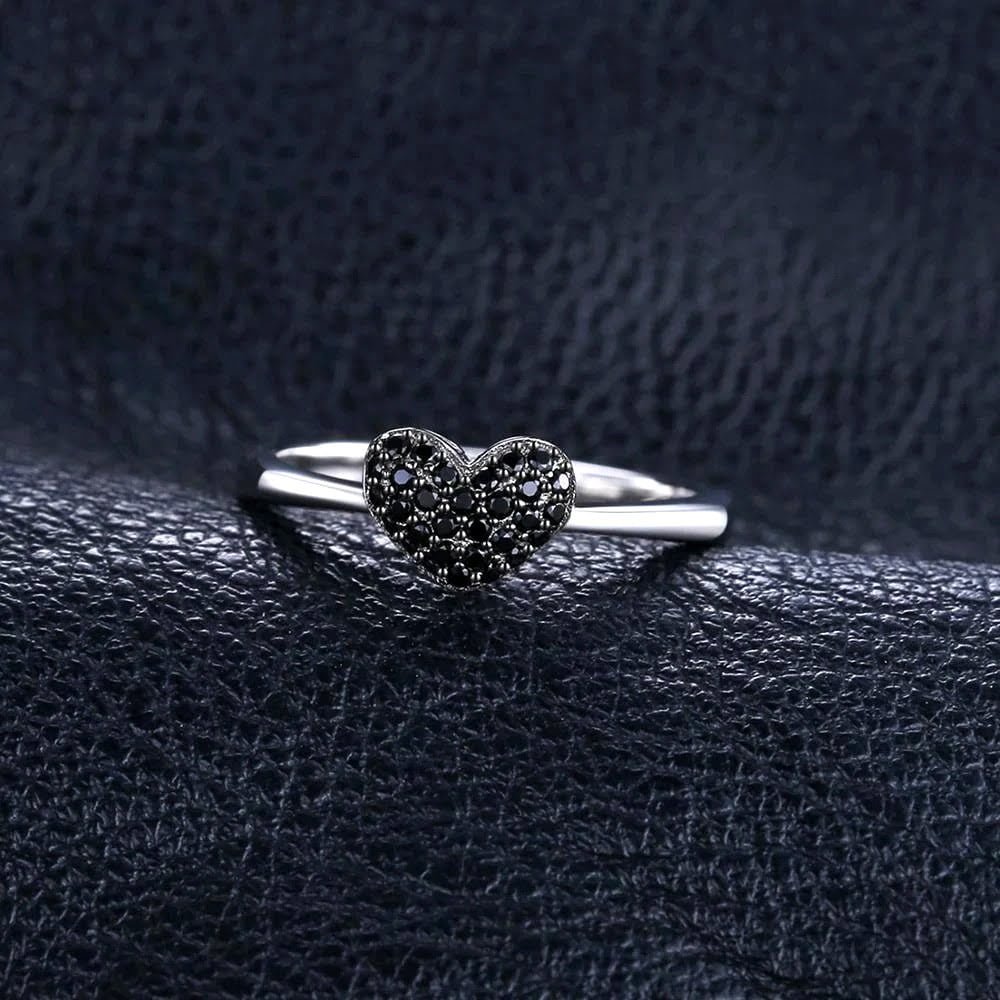 Sidabrinis 925 prabos žiedas Juoda širdis tai puikus pasirinkimas mėgstančioms smulkius minimalistinio dizaino papuošalus. Plonas žiedelis, kurio pagrindinis akcentas nedidelė 6mm skersmens širdelė inkrustuota juodo cirkonio kristalais. Dėvėdama šį žieda, Jūs nešiojate daugiau nei tik grožį. Jūs nešiojate jausmų ir išraiškos mišinį, kuris prideda elegancijos ir paslaptingumo įvaizdžiui bei primena gyvenimo prasmę. Labai dailus ir elegantiškas žiedas Juoda širdis sveria 2.0 gramus ir gali būti derinamas su tokio pačio dizaino auskarais ir pakabuku ant kaklo.