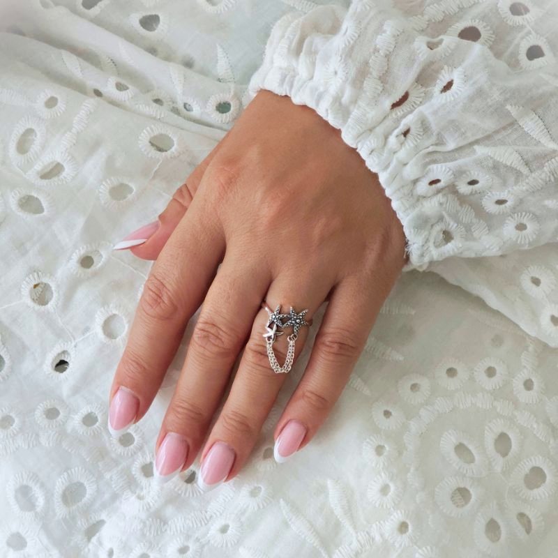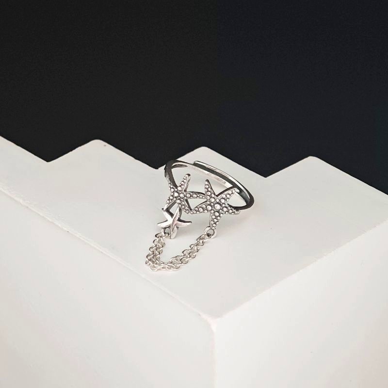 Sidabrinis žiedas Oceana tai išskirtinis jūros pasaulio įkvėptas papuošalas su koralų ir žvaigždžių motyvais. Kruopščiai išdirbtos detalės ir grandinėlės akcentas suteikia jam bohemiško žavesio bei išskirtinumo. Žiedas Oceana pagamintas iš tikro 925 prabos sidabro, kuris yra tvarus, ilgaamžis ir visuomet vertingas pasirinkimas. Šis akcentas puikiai papildys vasarišką įvaizdį, patiks moterims, mėgstančioms pajūrio estetiką ir originalius papuošalus. Sidabrinis žiedas Oceana sveria 2.5 gramo, o dydis reguliuojasi pagal piršto apimtį, todėl puikiai tiks nešiojančioms net 16-20 dydžius. Esminis tokio žiedo privalumas, kad priklausomai nuo nuotaikos, aprangos ar įvaizdžio, galite rinktis ant kurio piršto jį norite dėvėti.