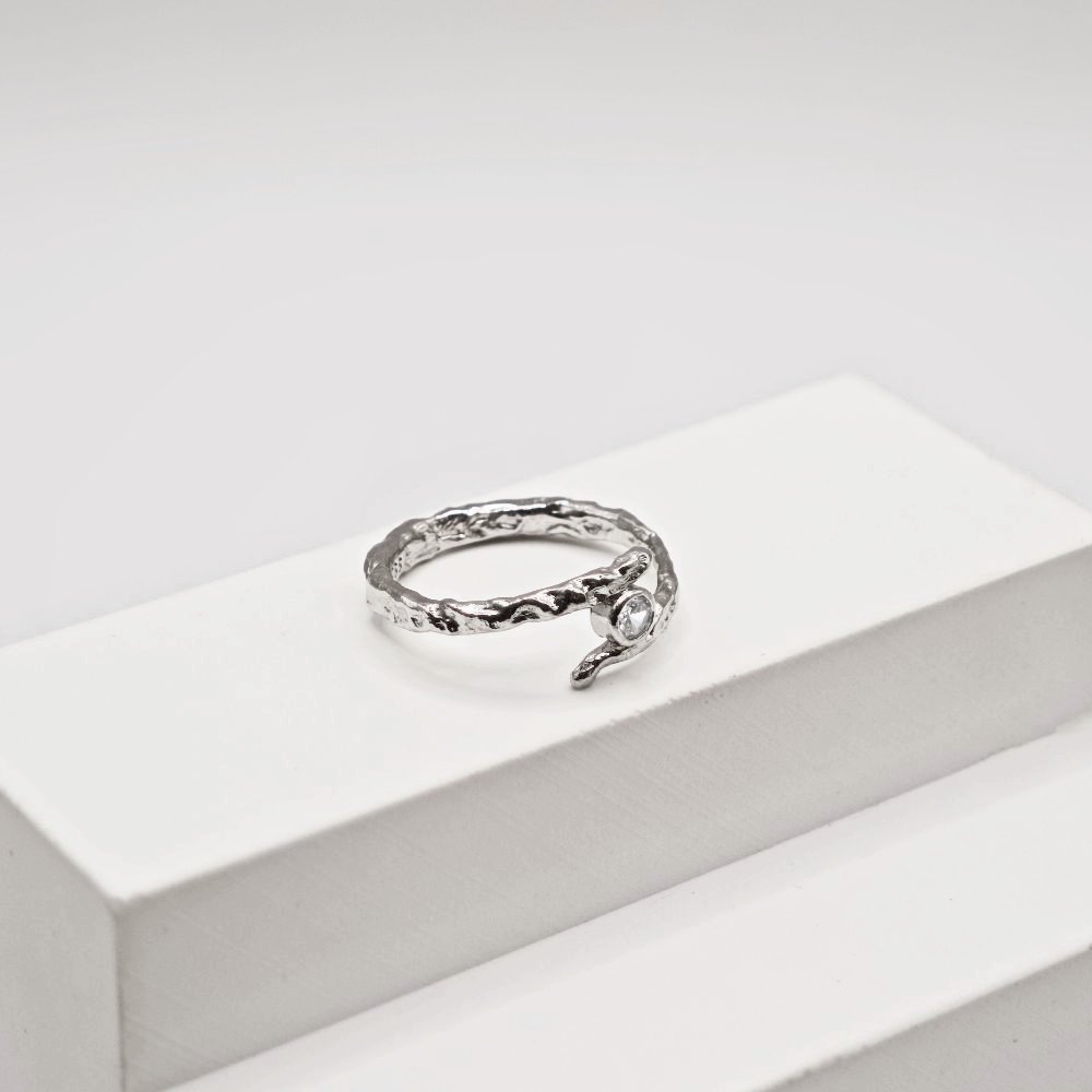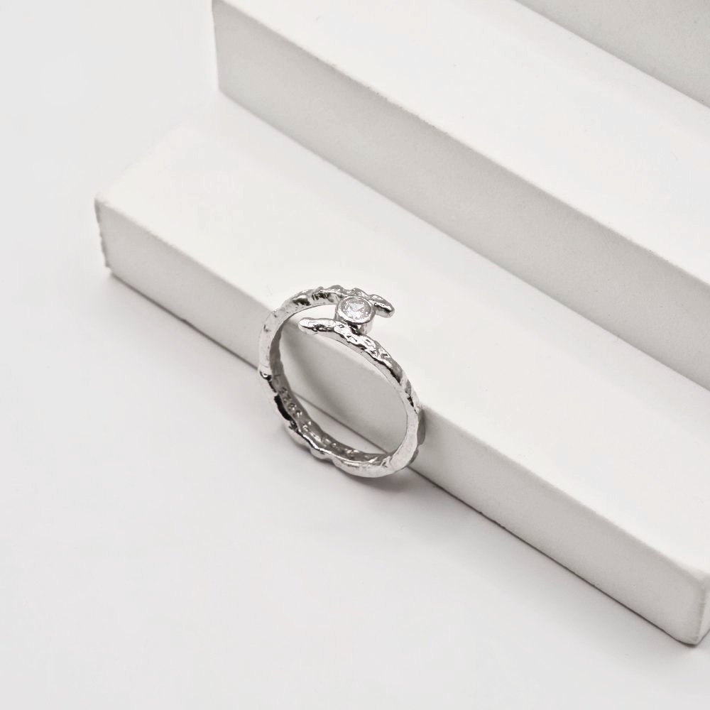 Sidabrinis žiedas Rift išsiskiria grubiomis linijomis, kurios suteikia unikalumo ir atskleidžia rankų darbo pojūtį. Žiedo konstrukcija subtiliai apgaubia pirštą, o centre esantis skaidrus kristalas tampa pagrindiniu stiliaus akcentu. Sidabrinis žiedas Rift pagamintas iš tikro 925 prabos sidabro, kuris vertinamas dėl ilgaamžiškumo, tvarumo ir estetinės vertės. Šis aksesuaras puikiai tinka moteriai, kuri renkasi modernius, išskirtinio charakterio papuošalus kasdieniam ar proginiam stiliui. Sidabrinis žiedas Rift sveria 2.3 gramo ir yra gaminamas 2 dviejų dydžių: 16 ir 17.